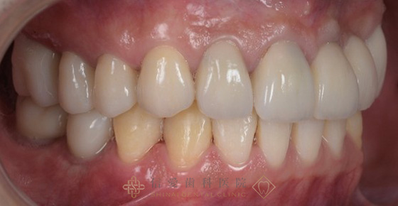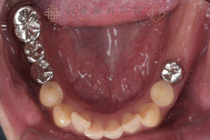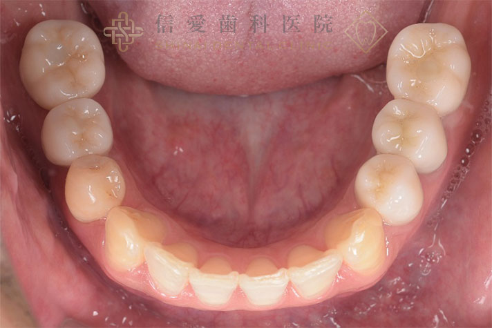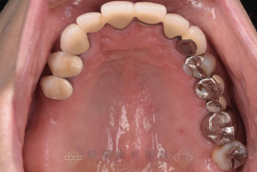 上顎:精密義歯(磁性アタッチメント) 下顎:被せ物(メタルセラミック、メタルセラミック)精密義歯 |