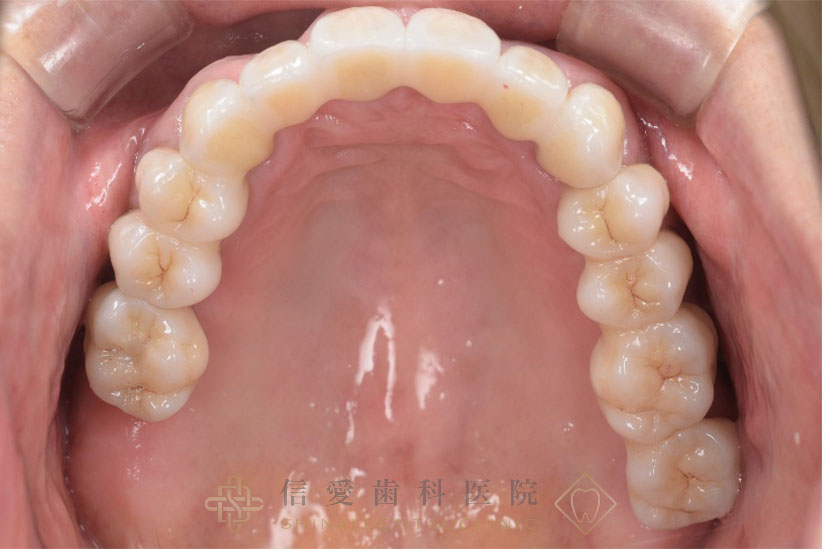 上顎:精密義歯(磁性アタッチメント) 下顎:被せ物(メタルセラミック)精密義歯(パーシャルパラレルミリング) |